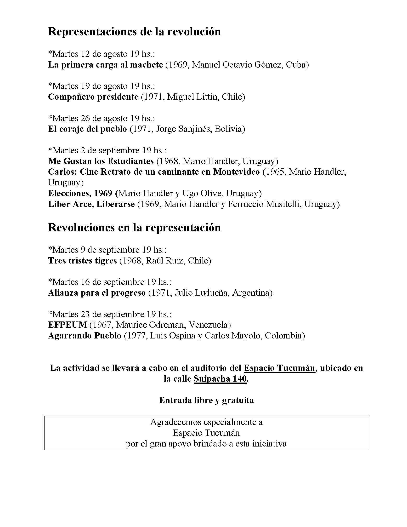 El ciclo propone una interrogación sobre una época convulsionada en la historia política de América latina utilizando a su cine como hilo conductor, desde sus modos de representación hasta sus tópicos. La idea general de la presente muestra es postular una sincronía entre ciertos procesos históricos revolucionarios y la adopción de determinados modos de representación inscriptos en la modernidad cinematográfica del cine latinoamericano, en lo que respecta a la experimentación con el lenguaje, los registros y los géneros. El ciclo se organiza sobre dos ejes temáticos que podrían condensarse en las siguientes preguntas: